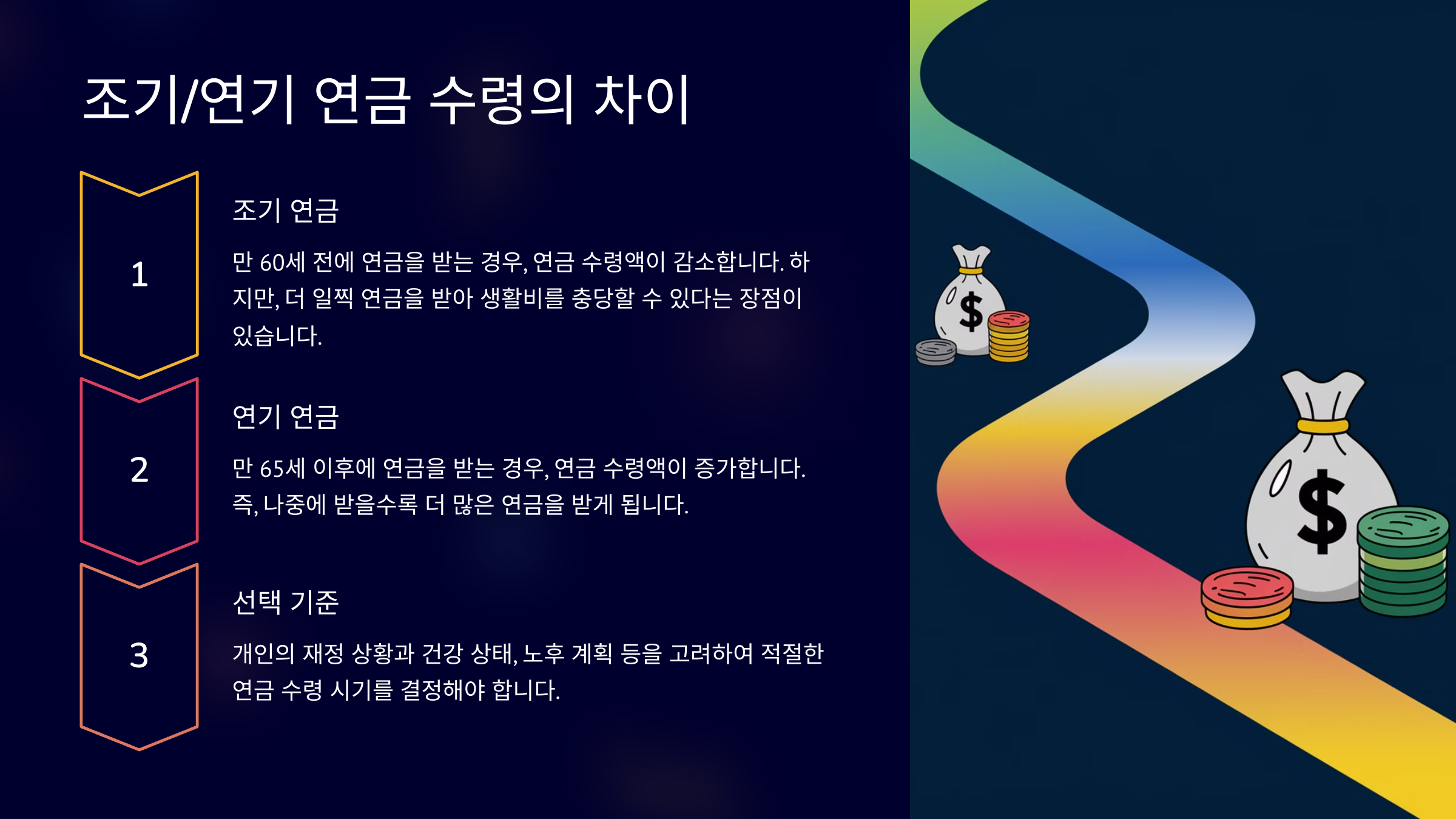 조기 연금은 급한 돈이 필요할 때 유용하지만, 장기적으로 보면 손해일 수 있어요. 반면, 연기 연금은 여유가 있다면 적극적으로 고려할 만한 선택지예요! 😊