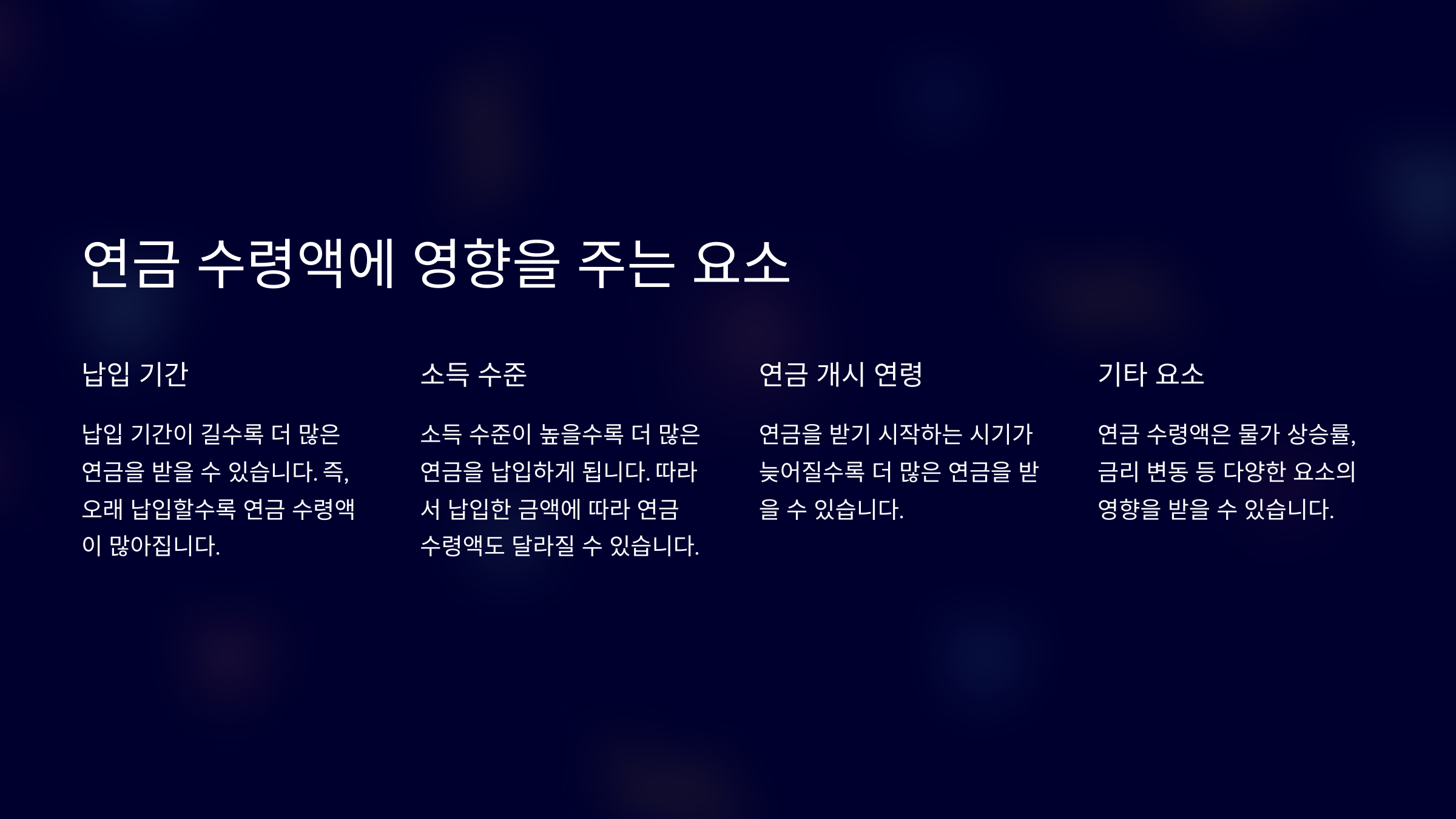 | 납부 소득 | 소득이 높을수록 연금 증가 | 평균 소득이 연금 수령액에 반영됨 |
