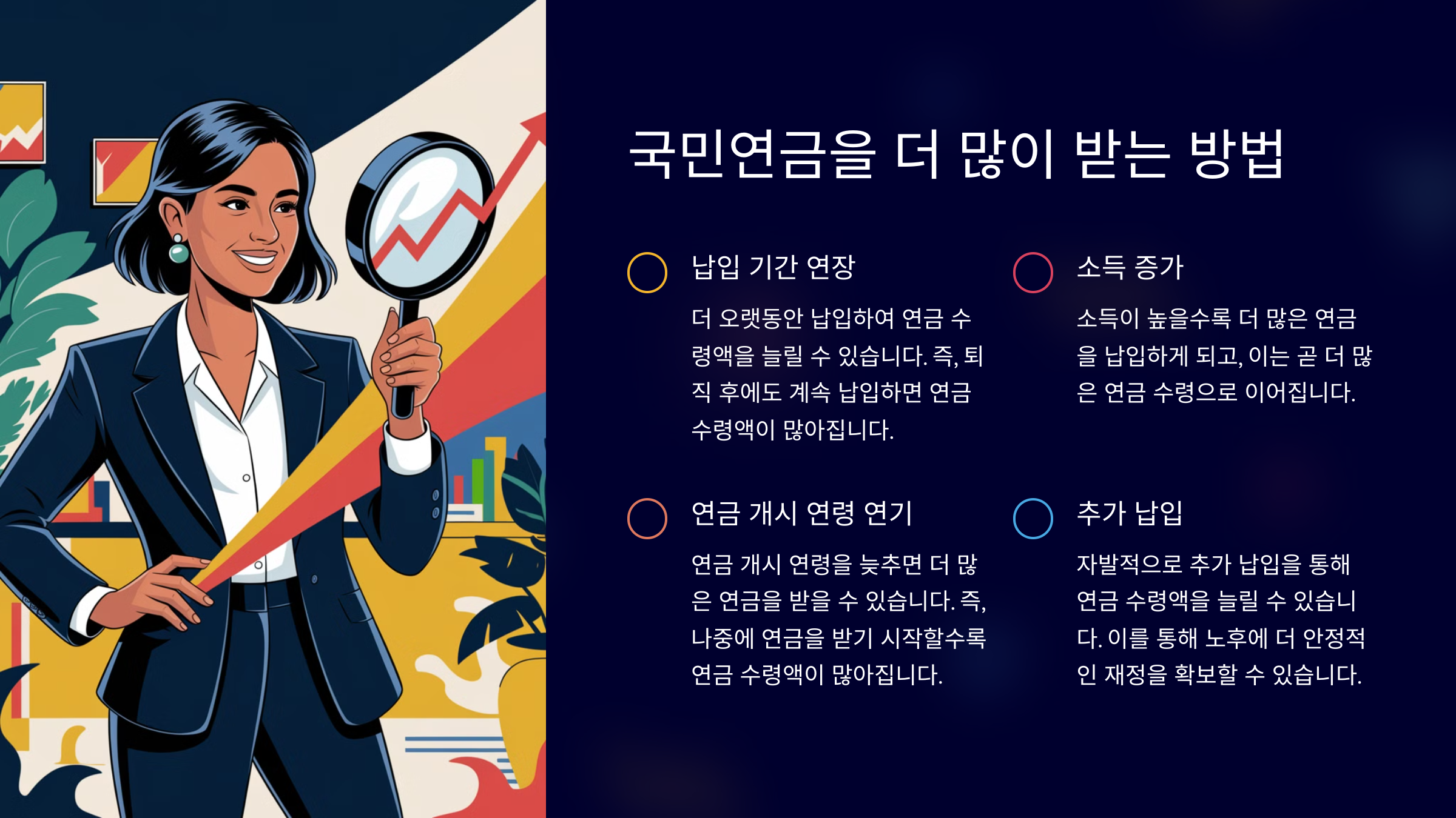위 요소들을 잘 활용하면 국민연금을 더 효율적으로 받을 수 있어요. 다음 섹션에서 연금을 더 많이 받을 수 있는 구체적인 방법을 알아볼게요! 😊