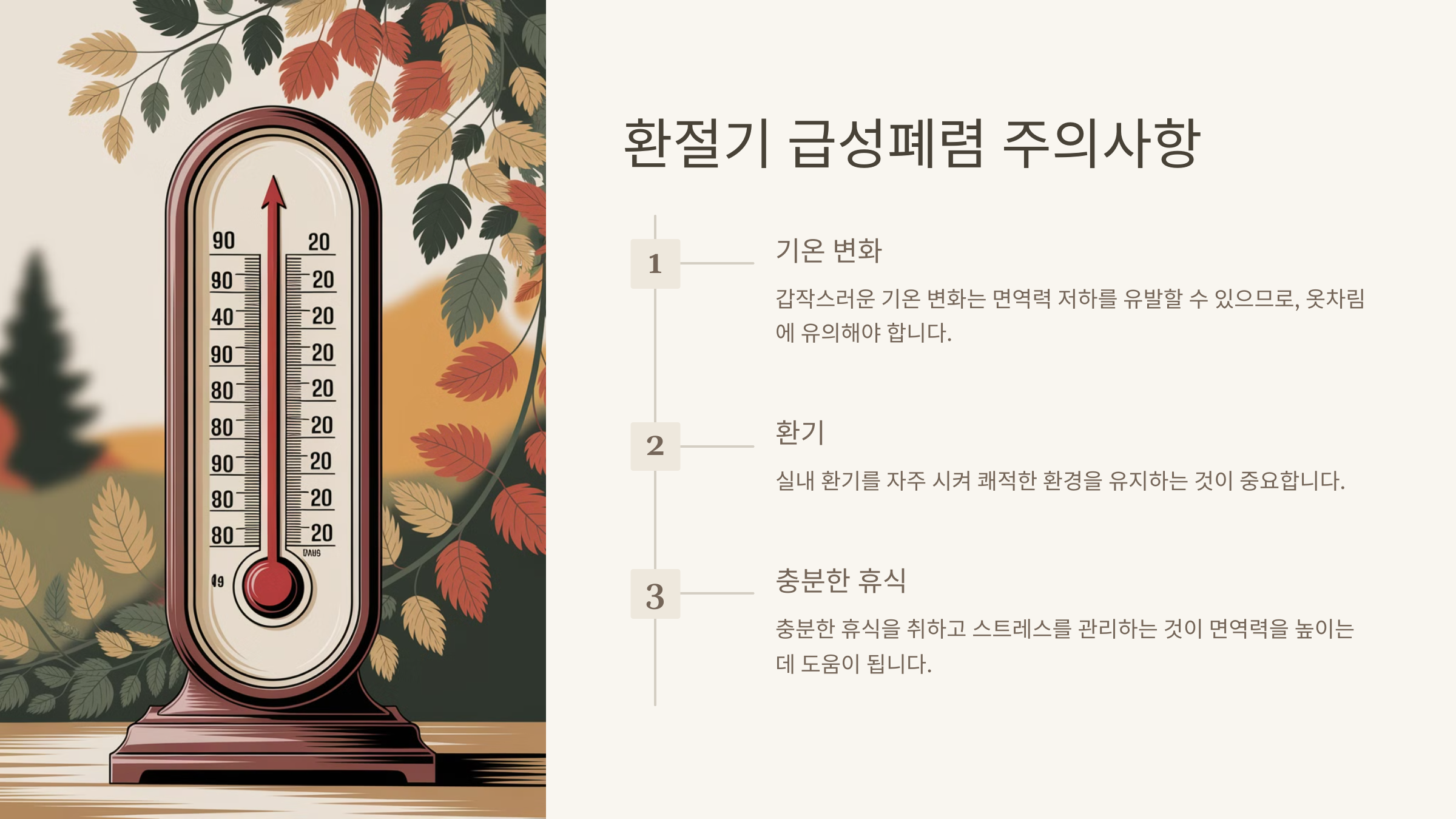 환절기에는 기온 변화가 크기 때문에 급성폐렴 발생 위험이 높아져요. 면역력을 유지하고 감기나 독감을 예방하는 것이 중요해요. 특히 실내 공기질 관리와 적절한 보온이 필요해요.