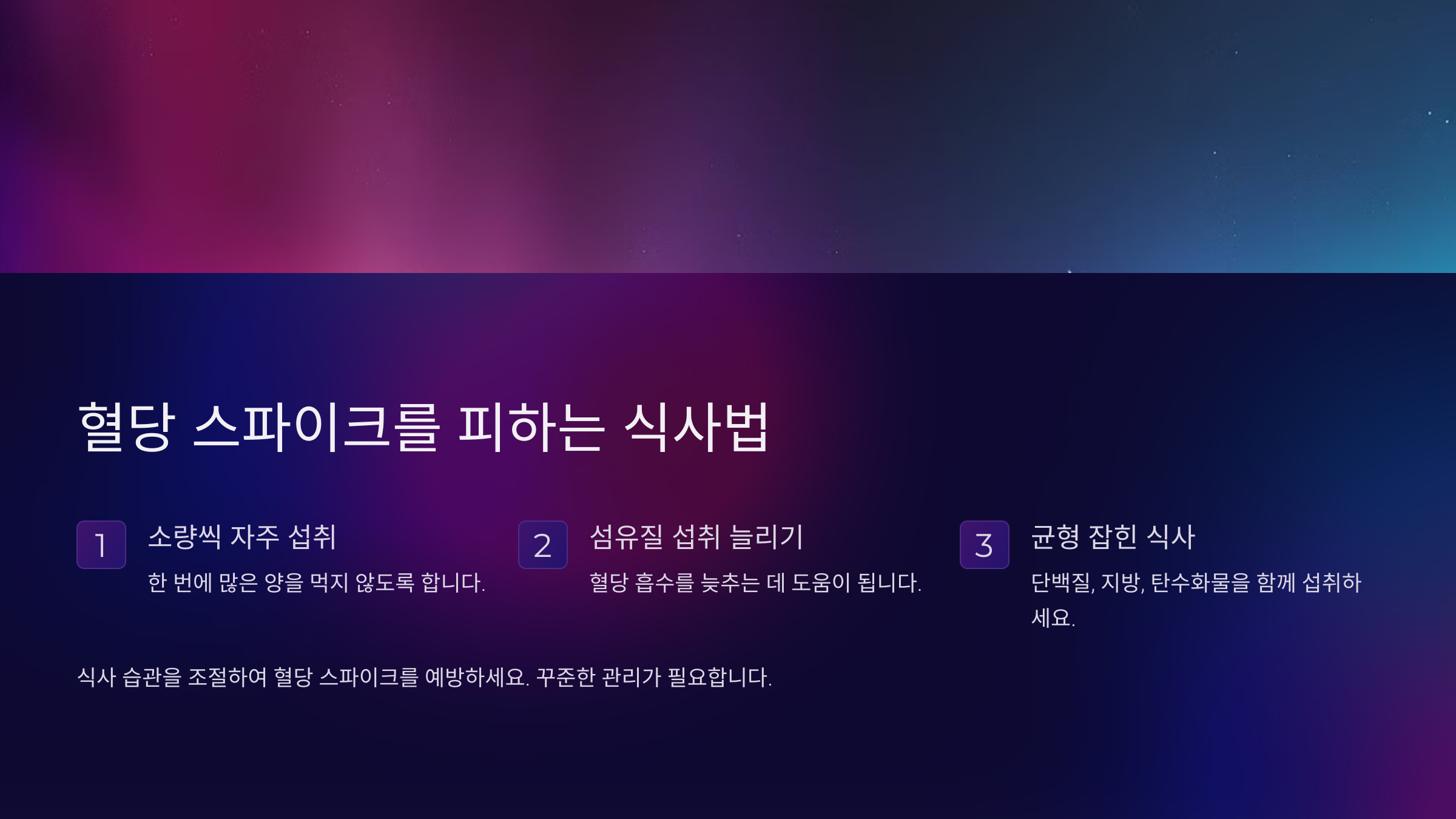 📌 **Tip!** - 탄수화물 섭취를 줄이고, 단백질과 섬유질이 풍부한 음식을 선택하세요. - GI(혈당지수)가 낮은 음식을 먹으면 혈당이 천천히 올라 당 조절에 좋아요. - 작은 식사를 하루 4~5번으로 나눠 먹으면 혈당 변동을 줄일 수 있어요.