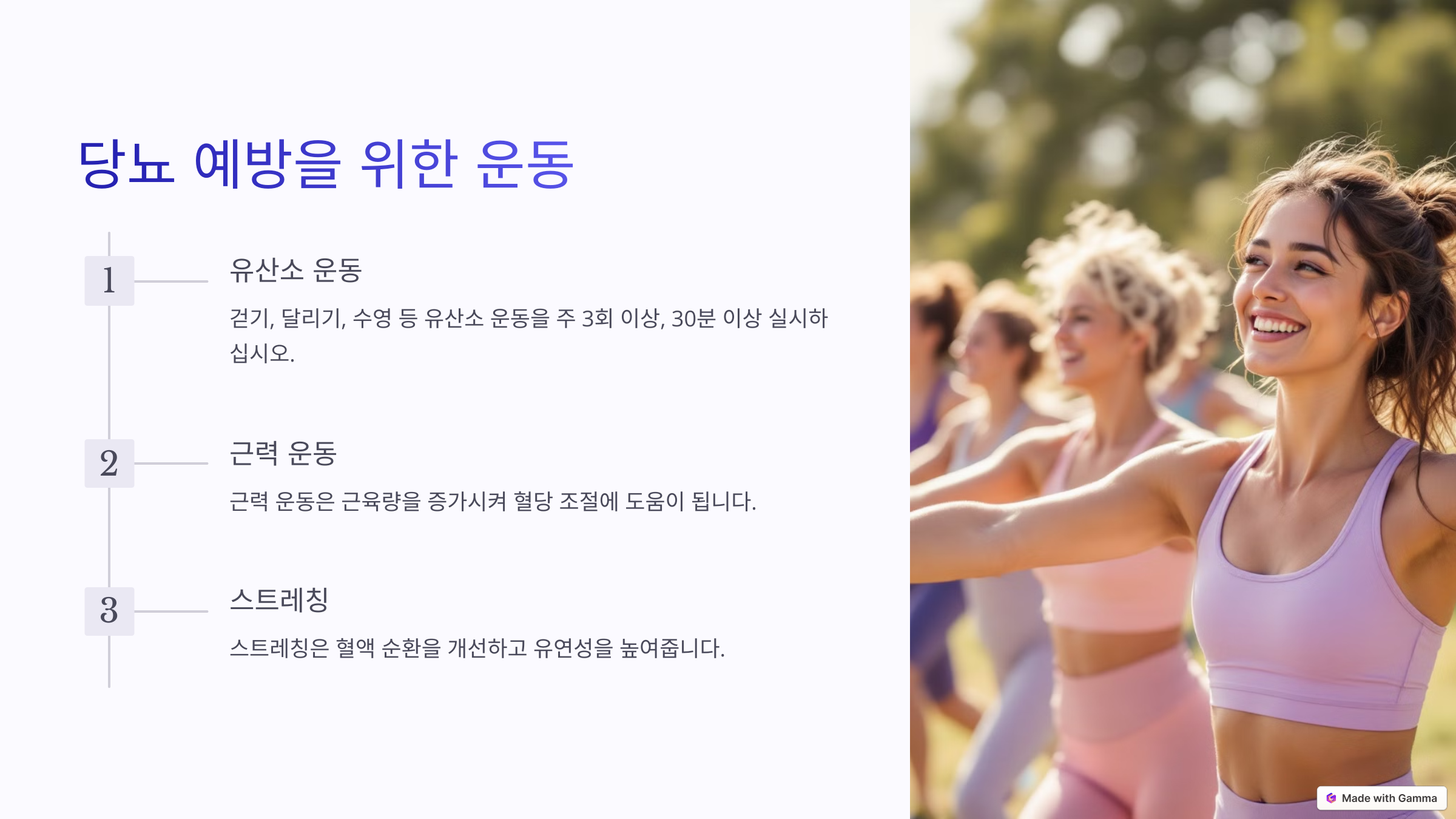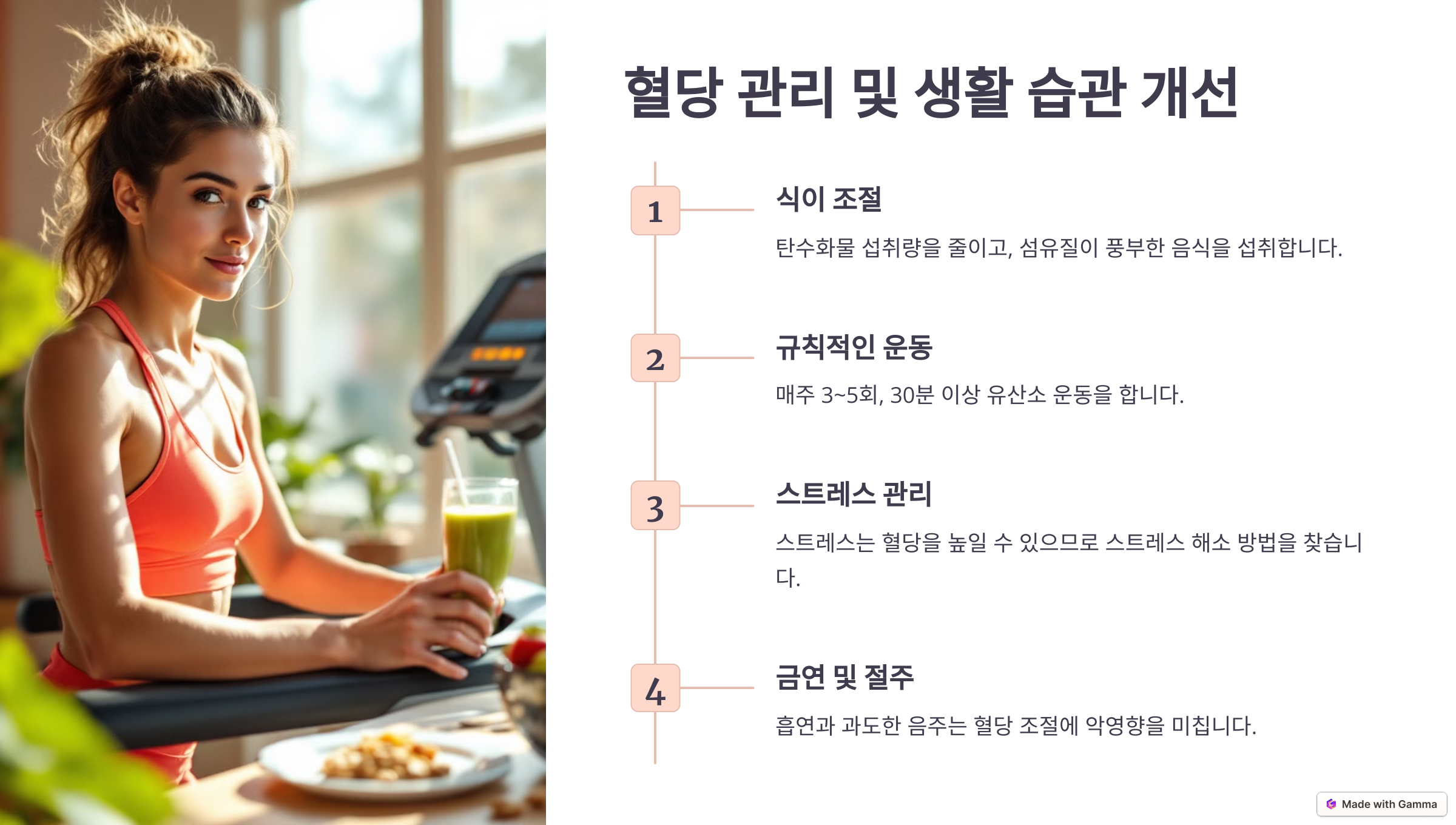 💪 규칙적인 운동: 유산소 운동(걷기, 자전거)과 근력 운동을 병행하면 혈당 조절에 좋아요.