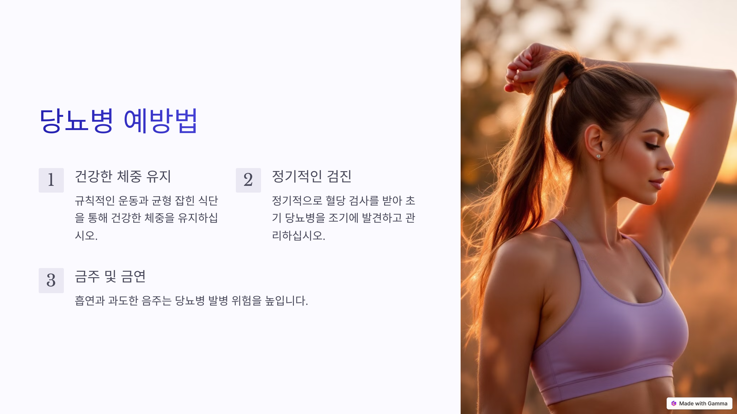 🛌 충분한 수면: 수면 부족은 인슐린 저항성을 높이므로 7~8시간 충분히 자는 것이 중요해요.