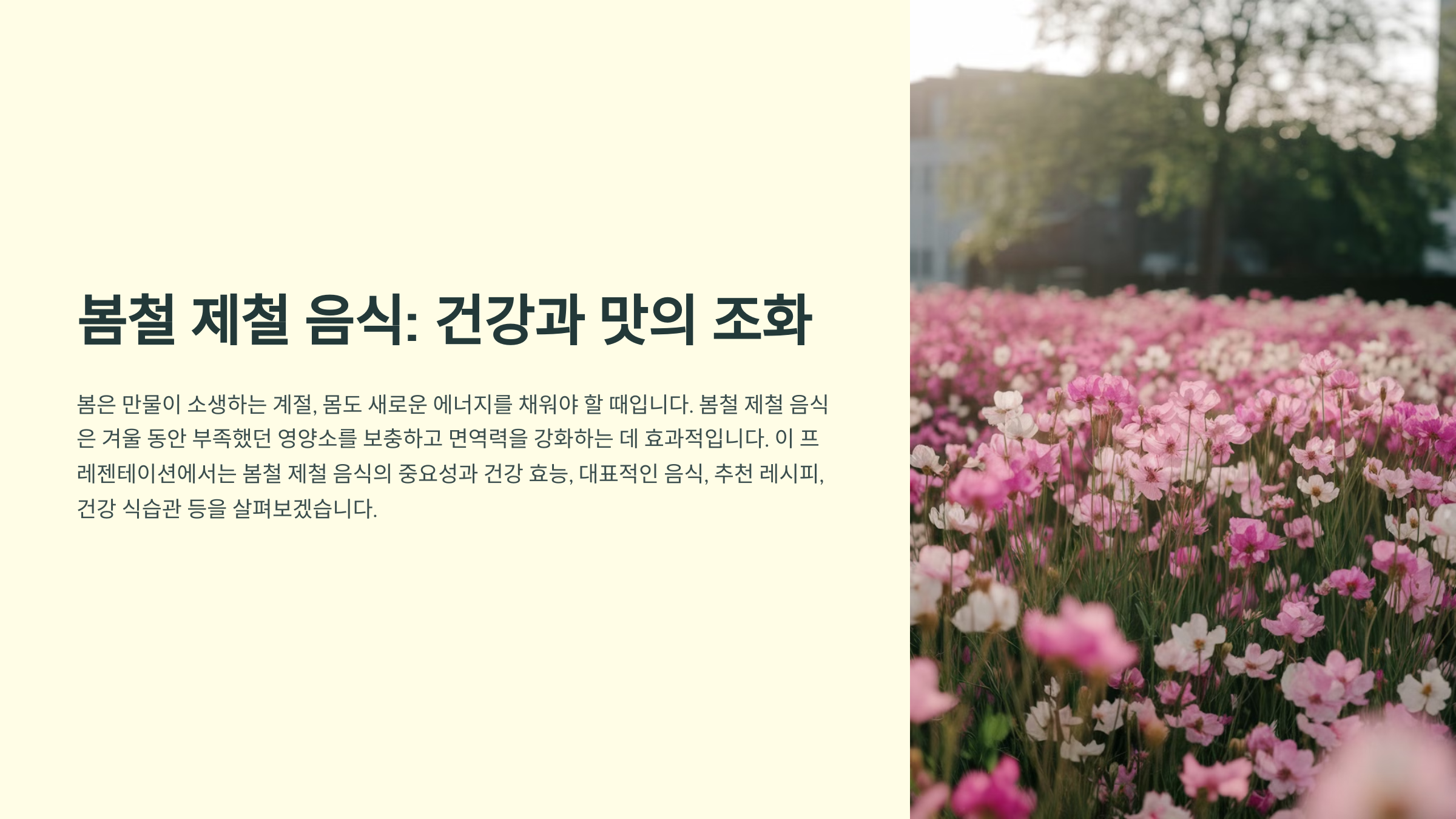 🌱 봄이 오면 겨우내 움츠렸던 몸이 활력을 되찾기 시작해요. 이 시기에는 신진대사가 활발해지면서 비타민과 무기질이 풍부한 봄나물을 먹는 것이 건강에 좋아요. 봄나물은 해독 작용을 돕고, 겨울 동안 쌓인 노폐물을 배출하는 데 도움을 주는 역할을 한답니다.