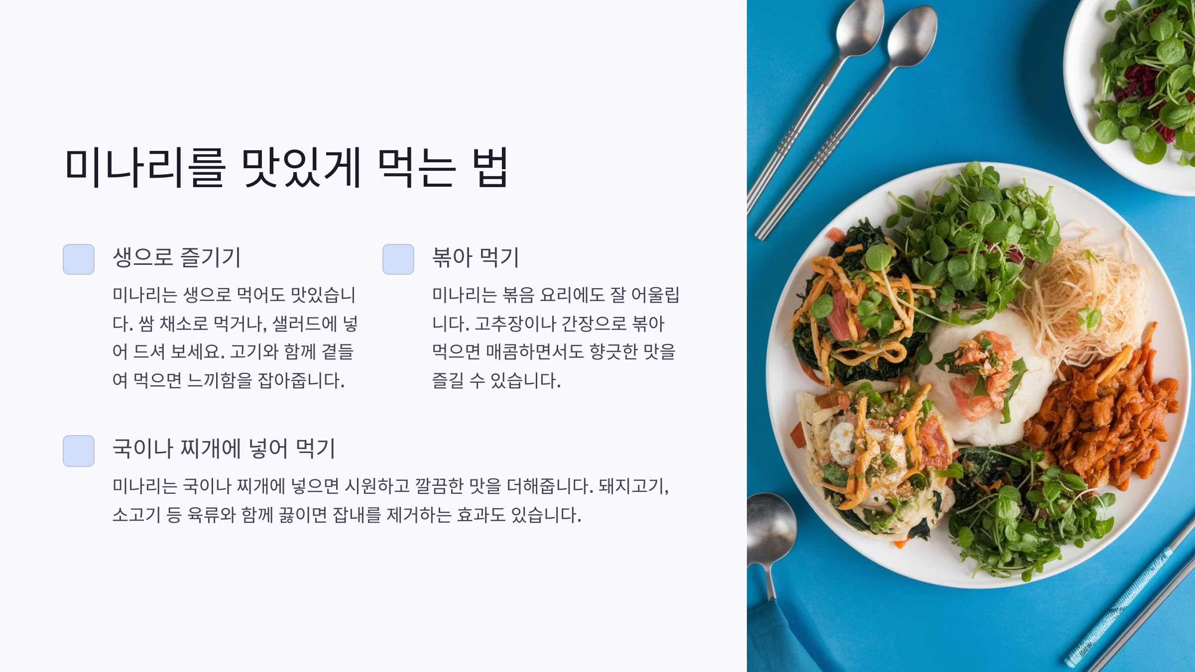 A1. 네, 생으로 먹을 수 있지만 쓴맛이 강해요. 보통은 데쳐서 무침이나 장아찌로 먹는 게 좋아요.