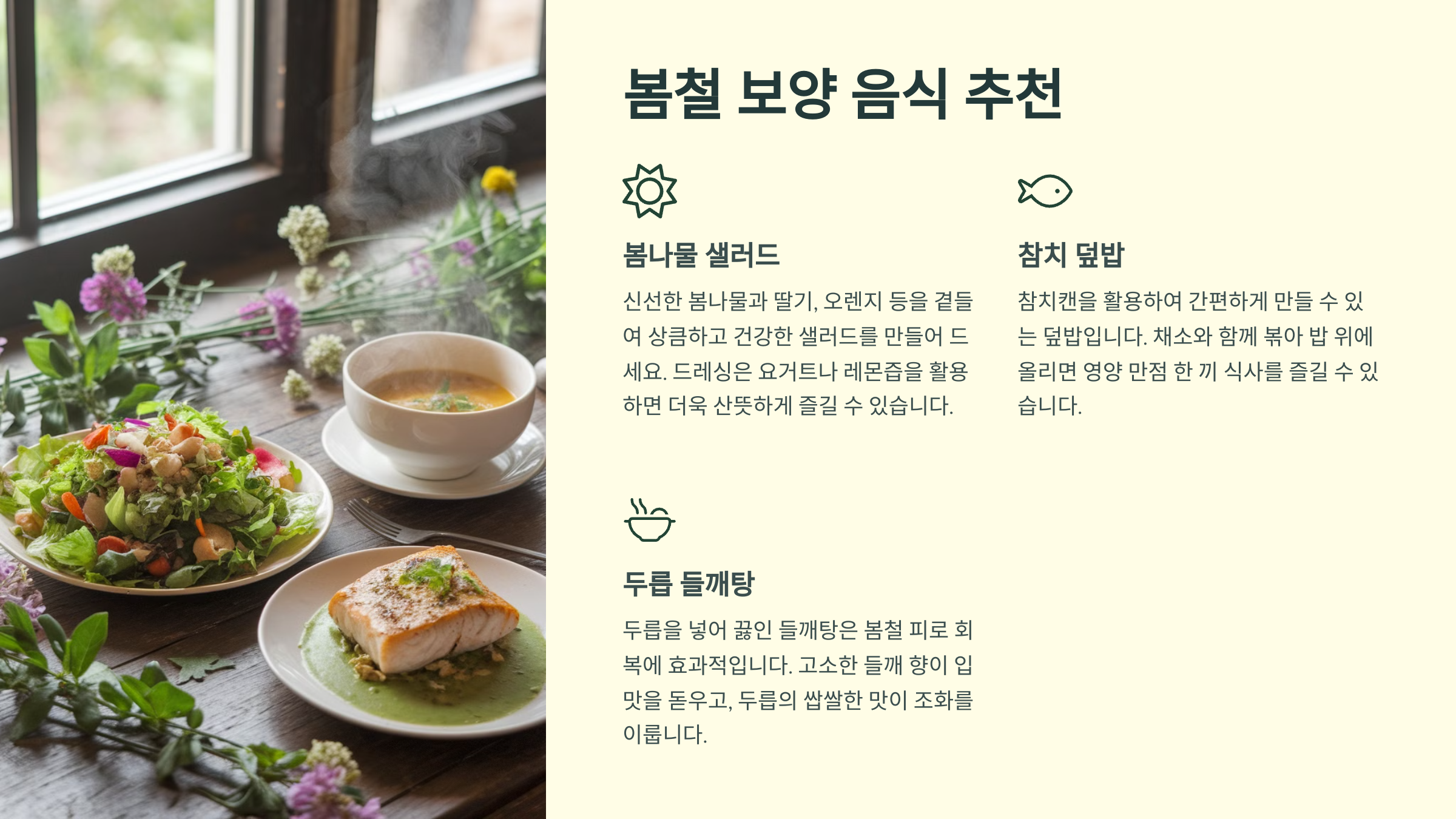 ✔️ 달래 된장국: 구수한 된장과 달래의 향이 조화를 이루는 따뜻한 국이에요.