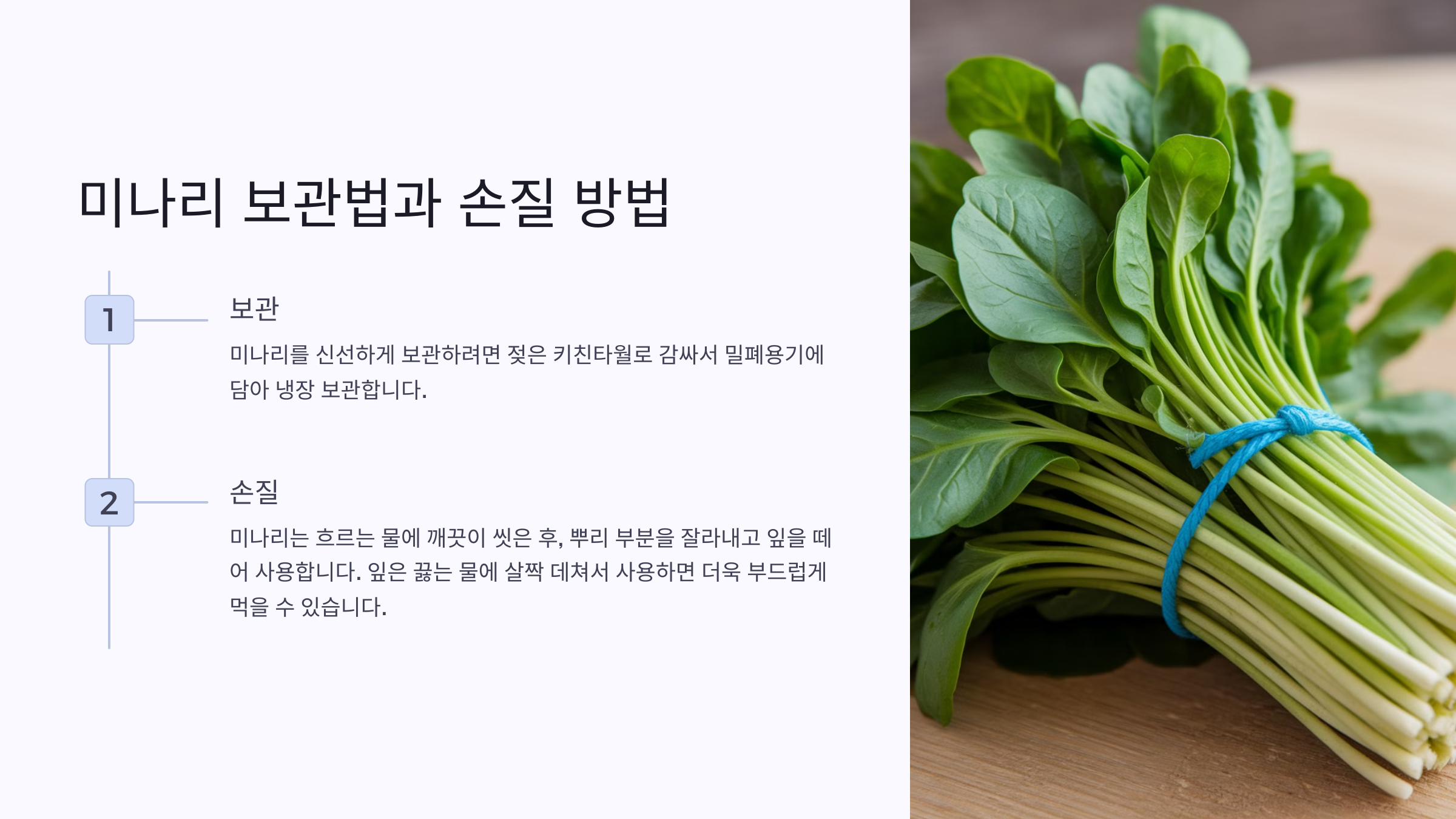 A2. 신선한 상태로 보관하려면 비닐팩에 담아 냉장 보관하거나 살짝 데쳐 냉동 보관하면 돼요.