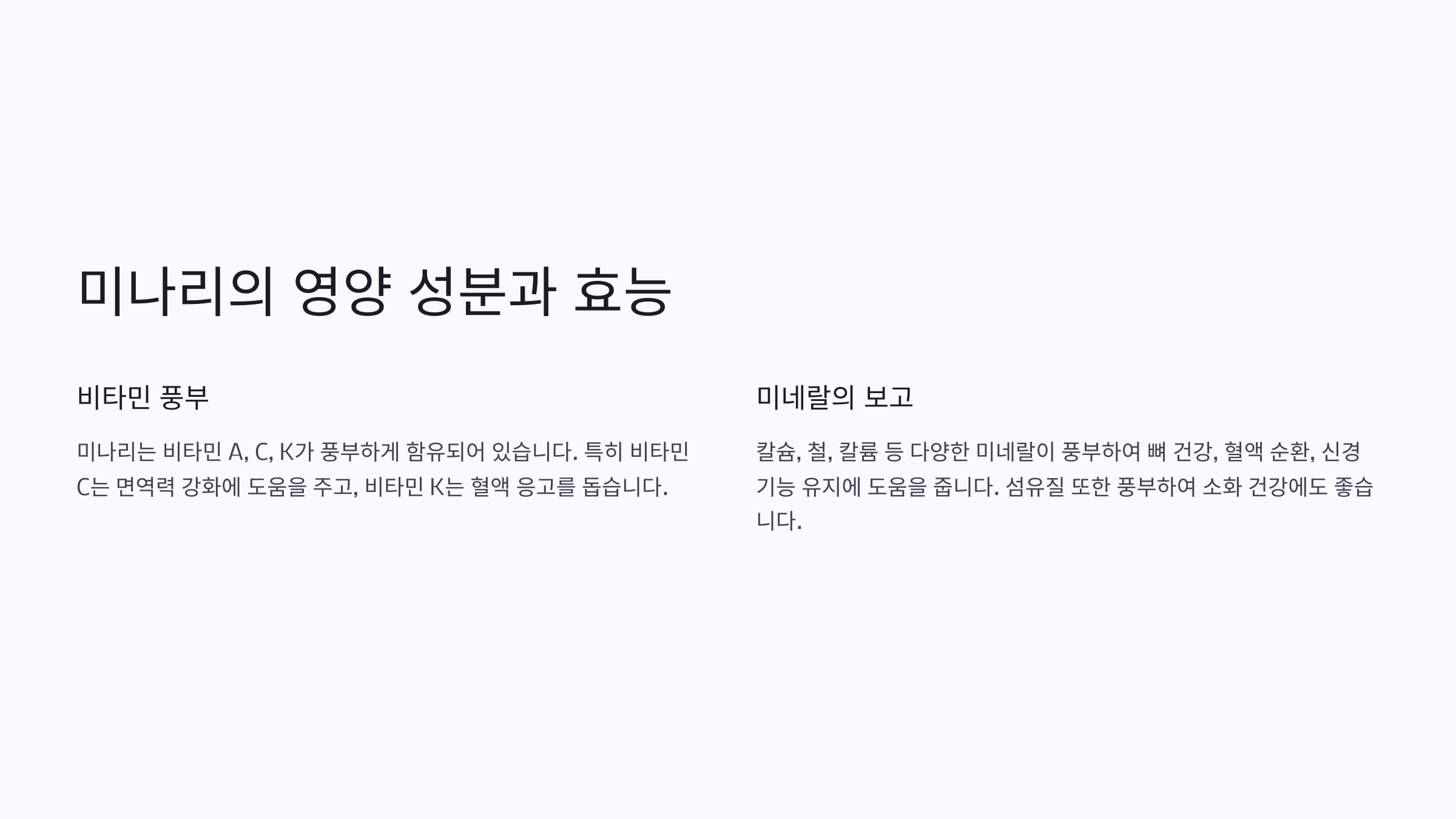 | 쑥 | 비타민A, 철분 | 해독 작용, 혈액순환 개선 |